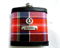 AberdeenTartan hip flask with thistle and custom engraved stainless steel tag made in Scotland using highest quality kilt tartan from prestigious Scottish weavers, and highest quality real leather trim with hand cast pewter thistle embellishment.