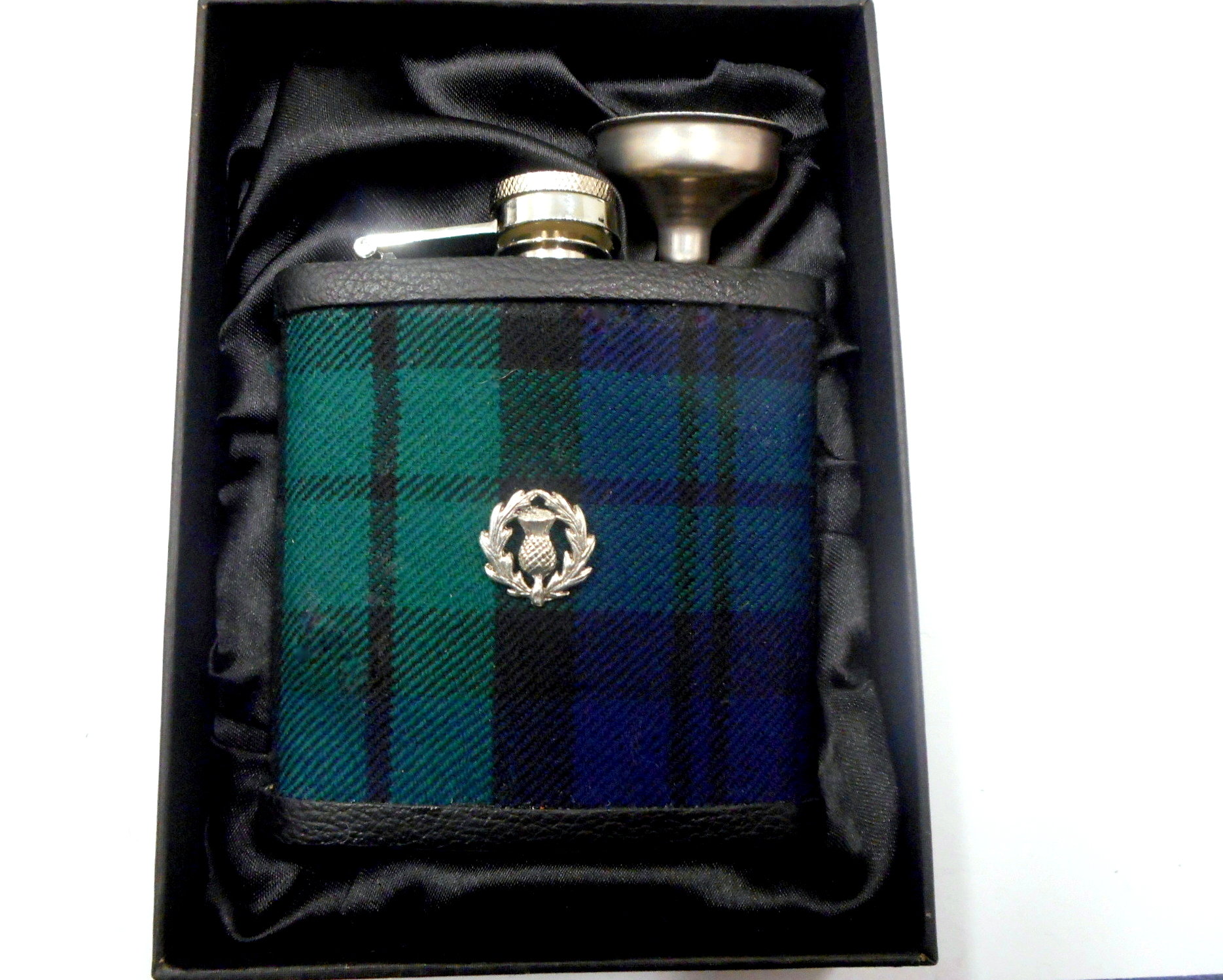 Hip flask in Black Watch pure wool kilt tartan with had cast pewter Thistle