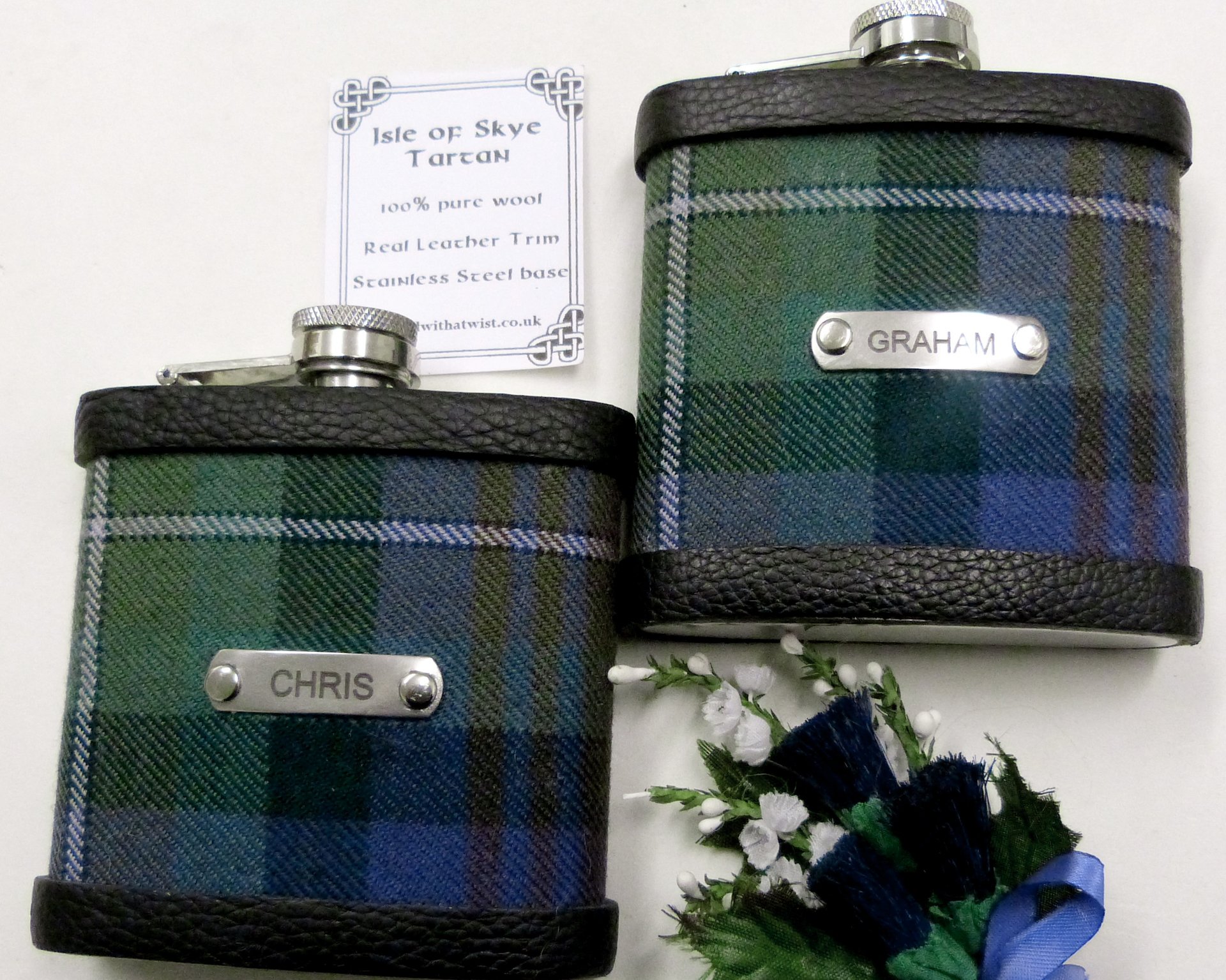 Your own Clan or Family tartan flask, with personalised stainless steel tag, with any name, initials, date , motto etc.