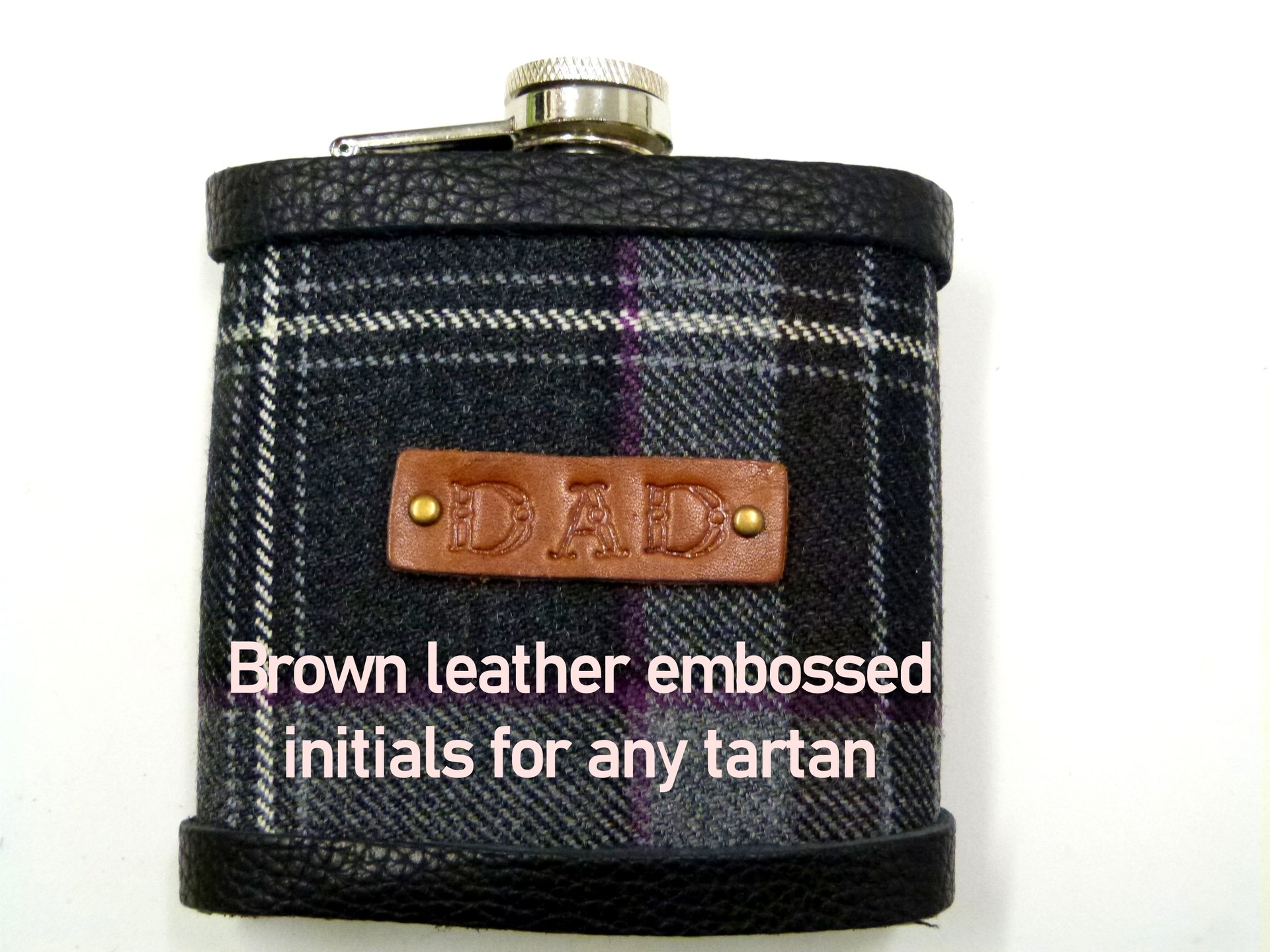 It subtle shades of grey, the tartan cover has real leather trim at top and bottom, and is set with a hand cast pewter thistle.