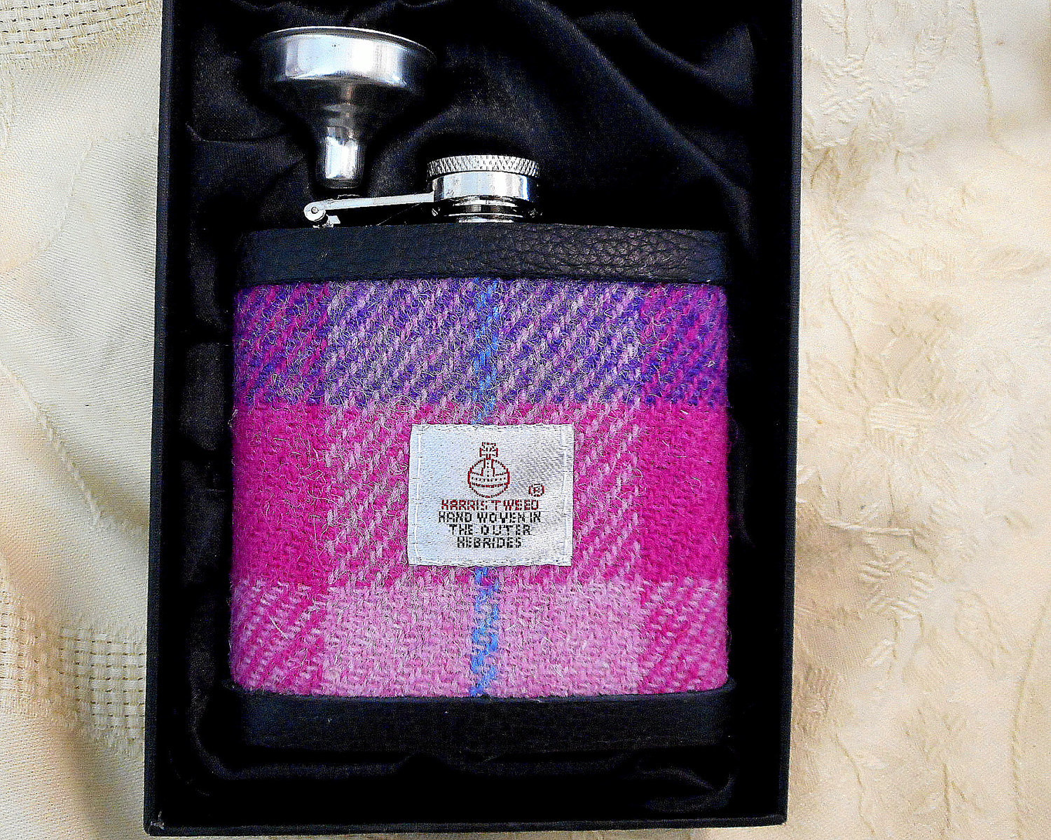 This beautiful hip flask features a luxurious Harris Tweed cover in a stunning purple and pink plaid weave tweed, with a little touch of blue.
