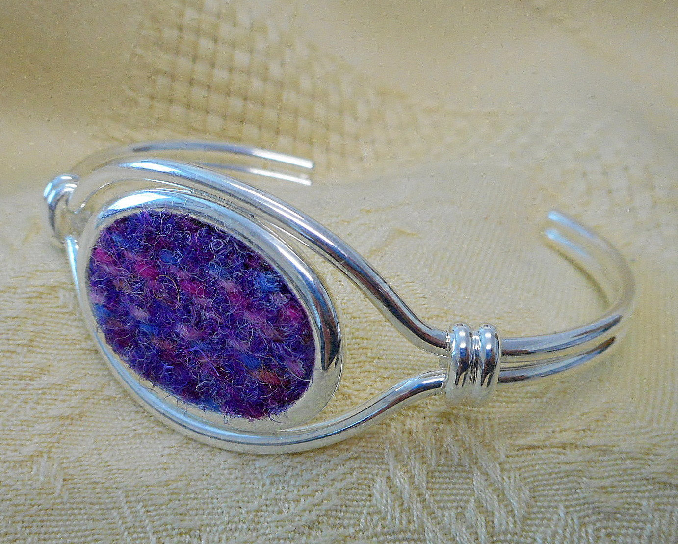This purple and pink Harris Tweed beautiful bangle with an oval shaped central feature set with a lovely pink and purple traditional Kaona weave. The bangle is silver plated, in a torque style, and has an ornate knotted design at either side.
