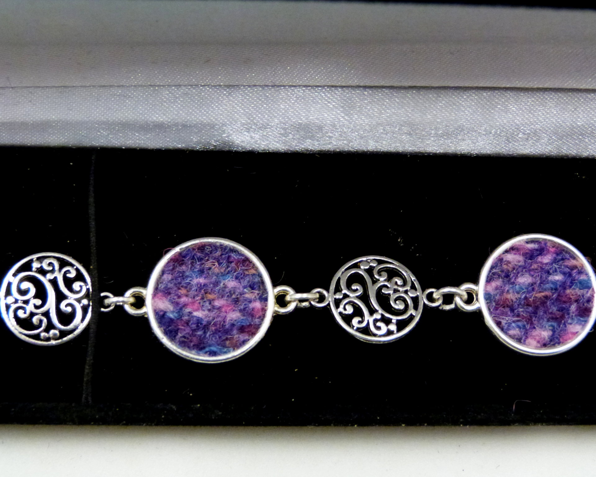 Purple, lilac and pinks in this Harris Tweed combine with delicate open spiral filigrees in this gorgeous bracelet.