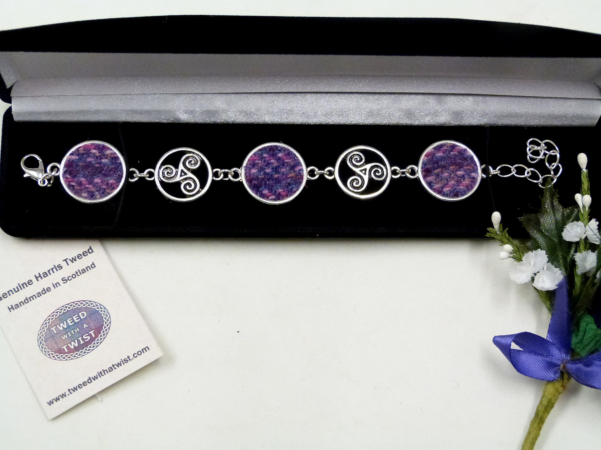 Soft shades of purple and pink Harris Tweed and Celtic Triskeles (triple spirals) combine in this gorgeous bracelet.
